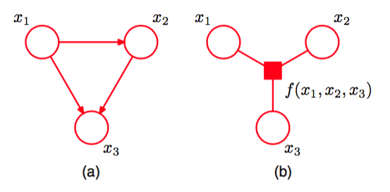 然而,在某些情况下,其他的表示因子图的方式可能更符合直觉,如因子图从有向图或者无向图中推导出的情形,正如我们将要看到的那样。